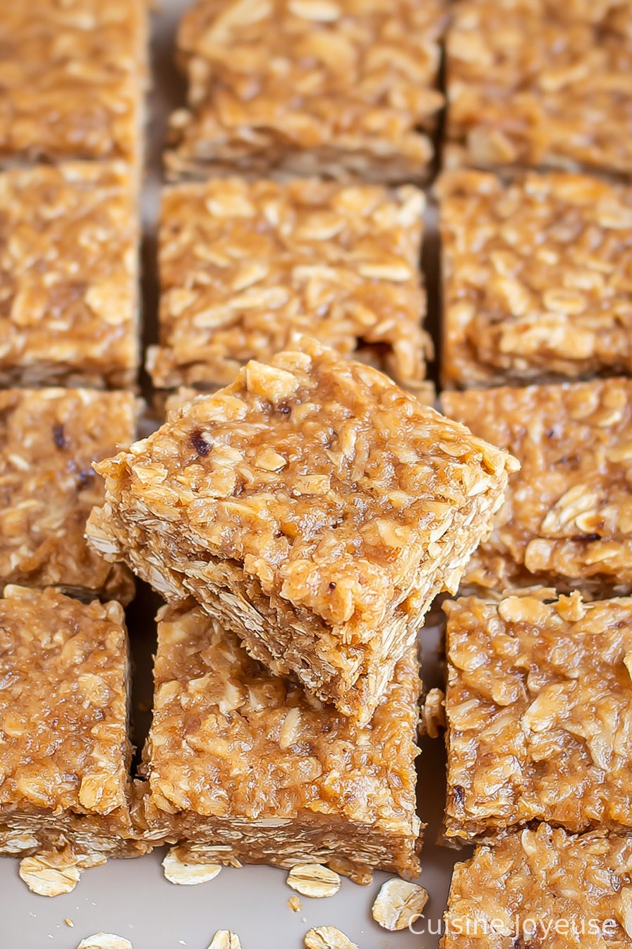 - Cool (just enough…) Wait 15 minutes before slicing, or your bars will crumble like a British crime drama. Patience: I rarely manage it, but it’s worth the wait.