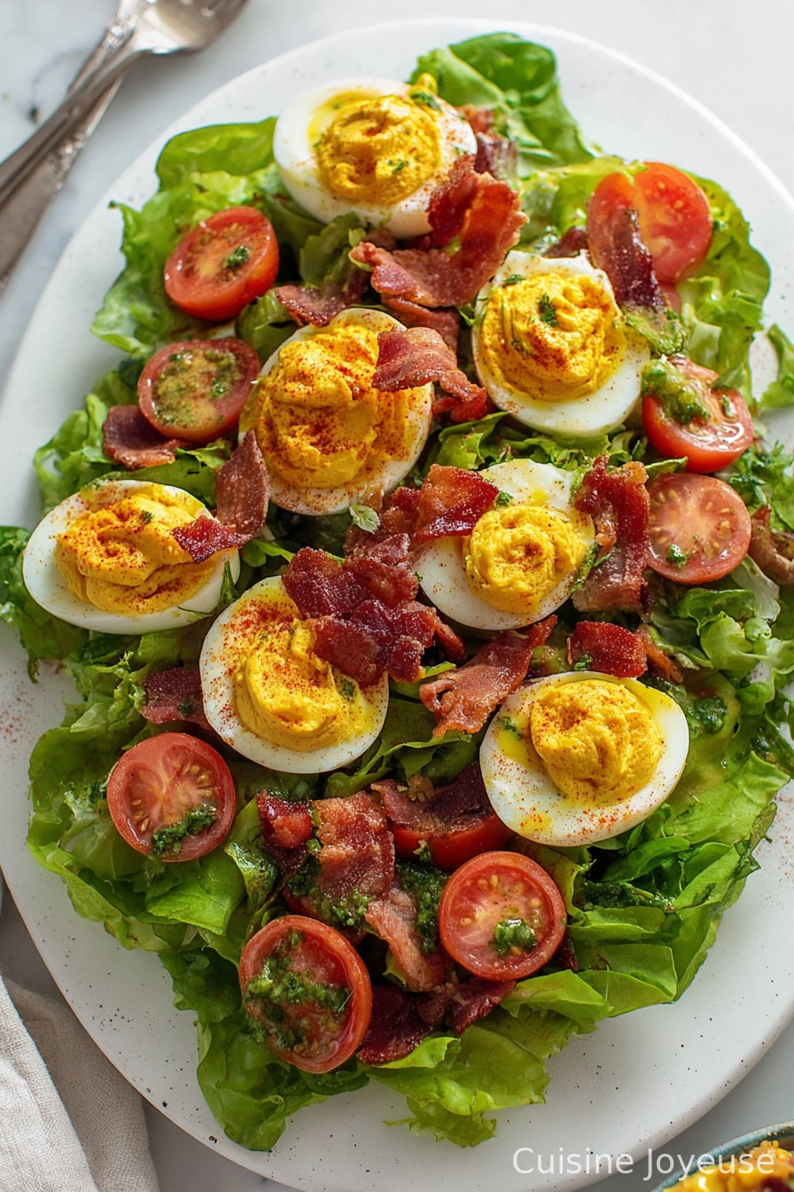 I make this when I want people to think I fussed but I actually didn’t—it’s just a pile of good stuff with a saucy vinaigrette. My family goes a bit loopy for it, especially if I don’t hold back on the bacon (sometimes I have to hide a few strips for myself or Paul will nick them). It’s one of those salads that doesn’t feel meager, you know? The kind that works as lunch, or dinner, or after you’ve been weeding all afternoon and need to eat now. Full disclosure: I keep meaning to skip the mayo in the deviled eggs and go healthier, but honestly, if you ask me, it’s just not the same. Also, if you accidentally overboil the eggs, they’re still fine—don’t sweat it.