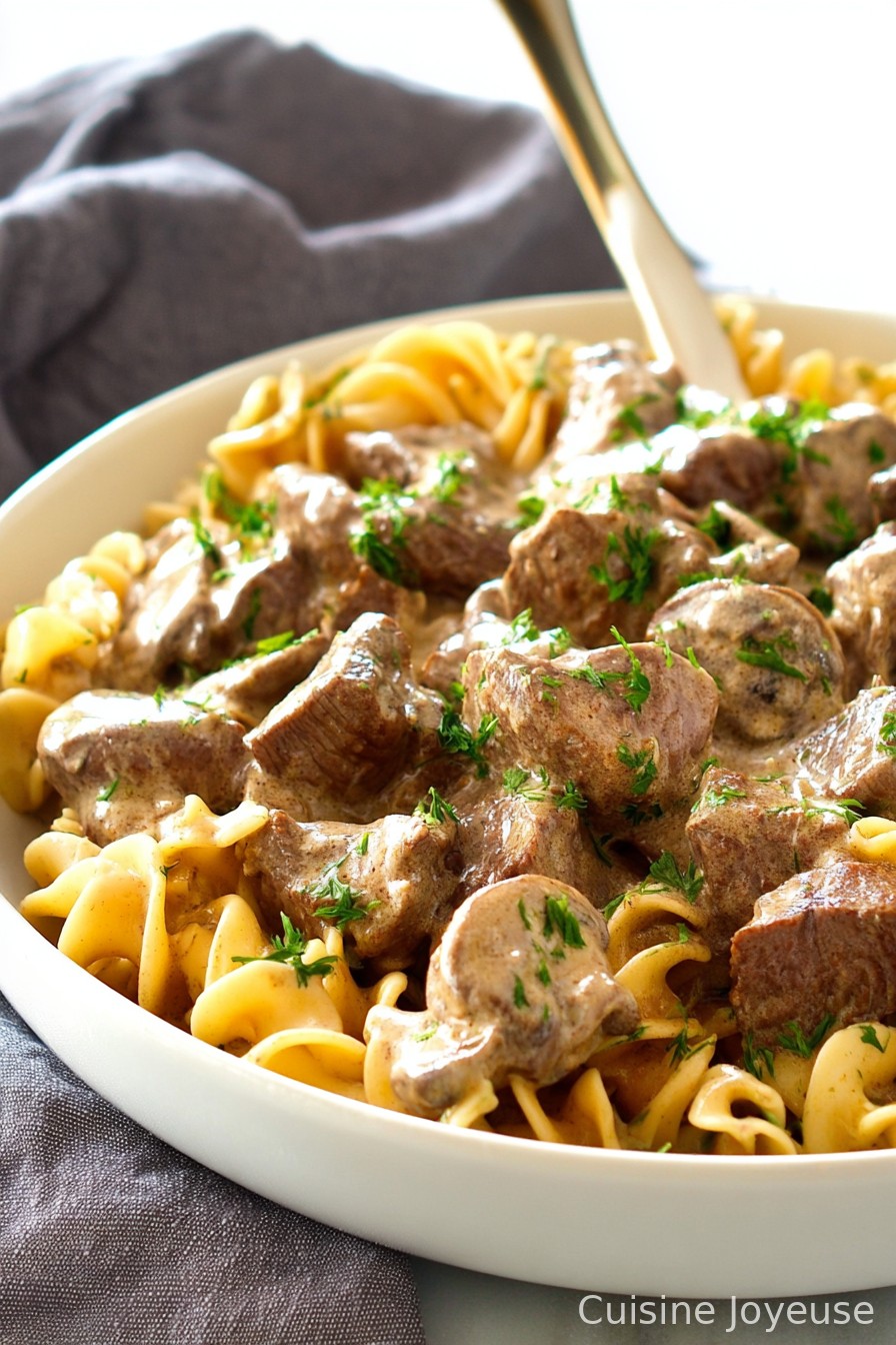 6Serve the stroganoff over cooked egg noodles and garnish with fresh parsley.